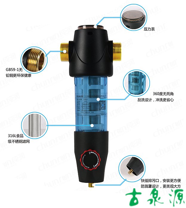 1.排污手柄結合人體工程學和視覺美學完美設計融合,更美觀實用 2.純潤藍半透明杯體,有效減少光線進入,減少藻類滋生 3.日期刻度記憶功能,方便安全 4.超大杯體,瞬間出水量更大 5.防水錘沖擊設計,更安全 6.標配一寸轉6分活接頭 7.5T/小時大流量