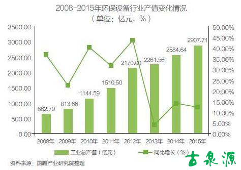 據(jù)前瞻產(chǎn)業(yè)研究院《中國環(huán)保設(shè)備行業(yè)市場前瞻與投資分析報告》顯示,2008-2015年,環(huán)保設(shè)備行業(yè)總產(chǎn)值逐年增長,年均復合增長率達到23.52%,但其增速波動較大。2015年,環(huán)保設(shè)備行業(yè)產(chǎn)值達到2907.71億元,較上年同期增長12.50%,增速較上年減少1.79個百分點。